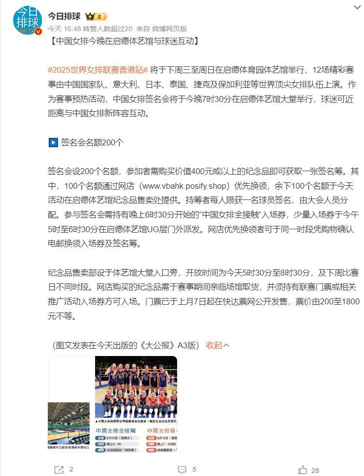 根據《大公報》的報道,中國女排抵達香港後將在今晚參與啓德體育園體藝館進行球迷互動,簽名會有200個名額,下週三至週日在啓德體育園將開展12場精彩的賽事,中國、意大利、日本、泰國、捷克、保加利亞等世界頂尖女排球隊都將亮相。