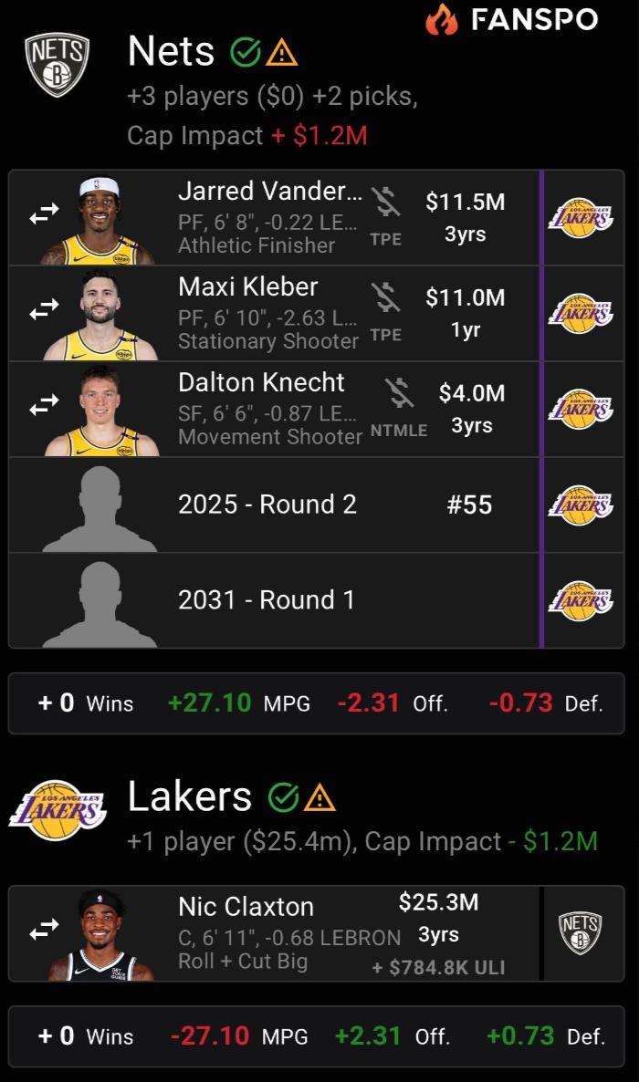 湖人用範德比爾特、克內克特、克勒貝爾、2031年首輪籤換來尼克-克拉克斯頓。