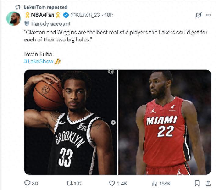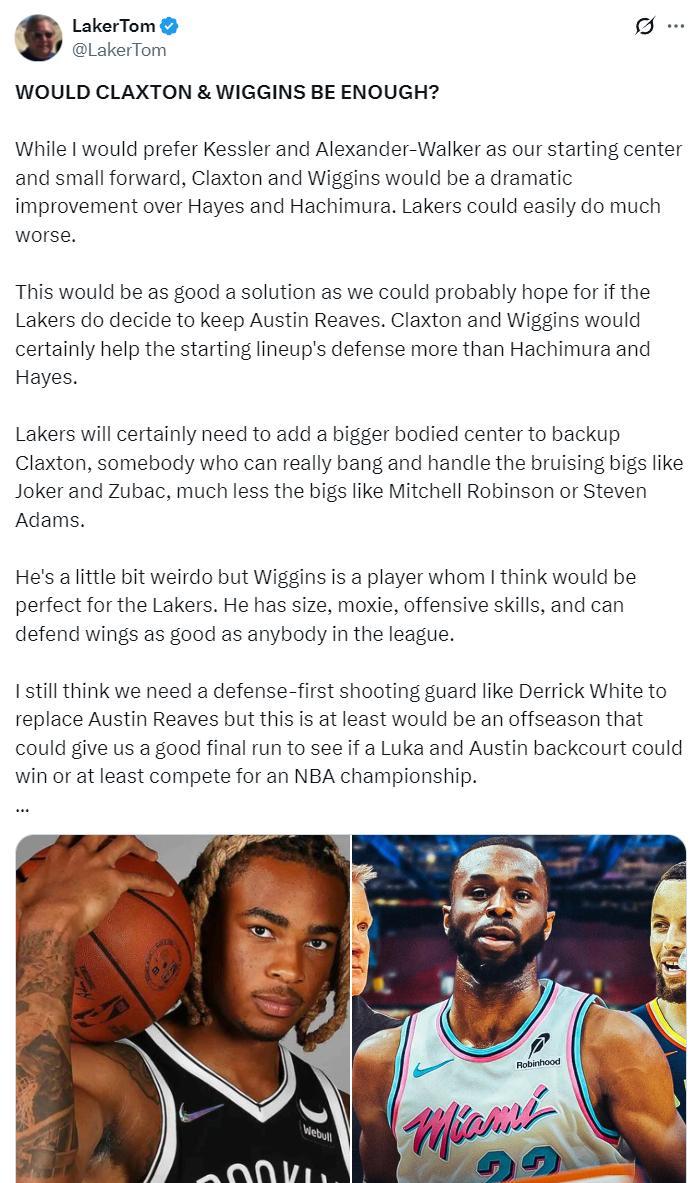 湖媒Laker Tom立馬跟蹤報道,雖然我更喜歡凱斯勒+亞歷山大-沃克擔任湖人的先發三號位與五號位,但如果引進這兩人失敗,克拉克斯頓與維金斯也是比八村壘/海耶斯更好的選擇。