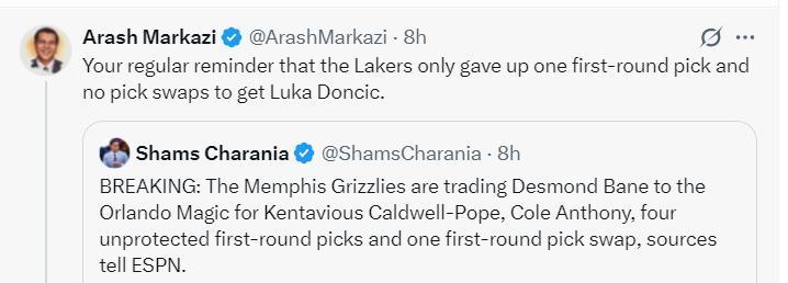 美記Arash寫道:東契奇只能換1個首輪籤,貝恩卻能換4個?