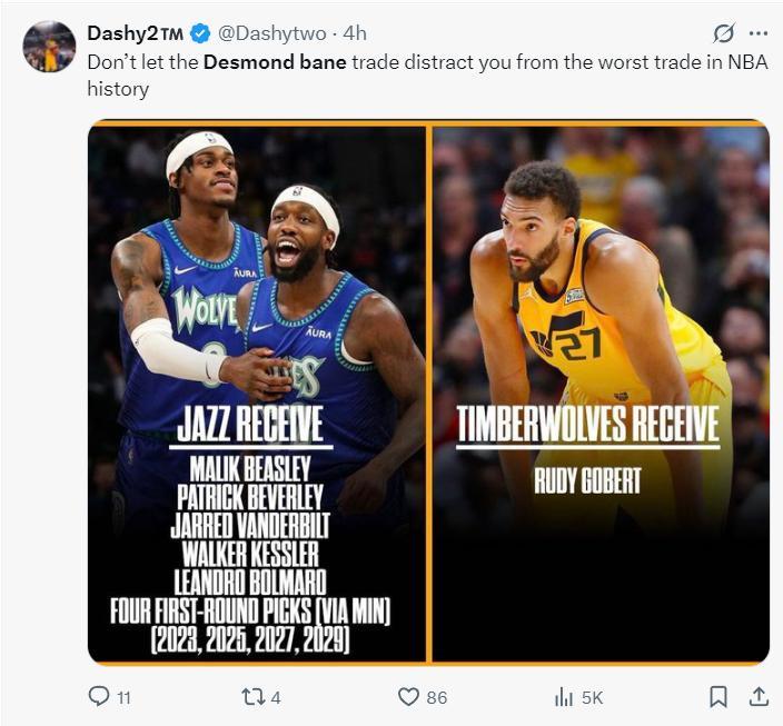 美媒曬出森林狼與戈貝爾的交易,當時戈貝爾是1換10,這筆交易中也有森林狼的四個首輪籤,美媒寫道:貝恩的交易分散了你對NBA歷史最糟糕交易的注意力。