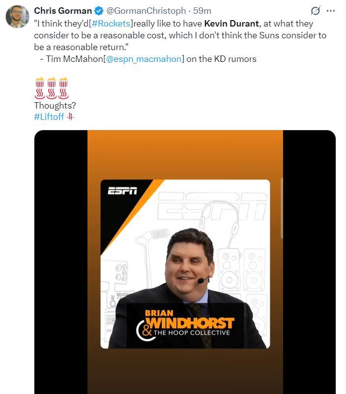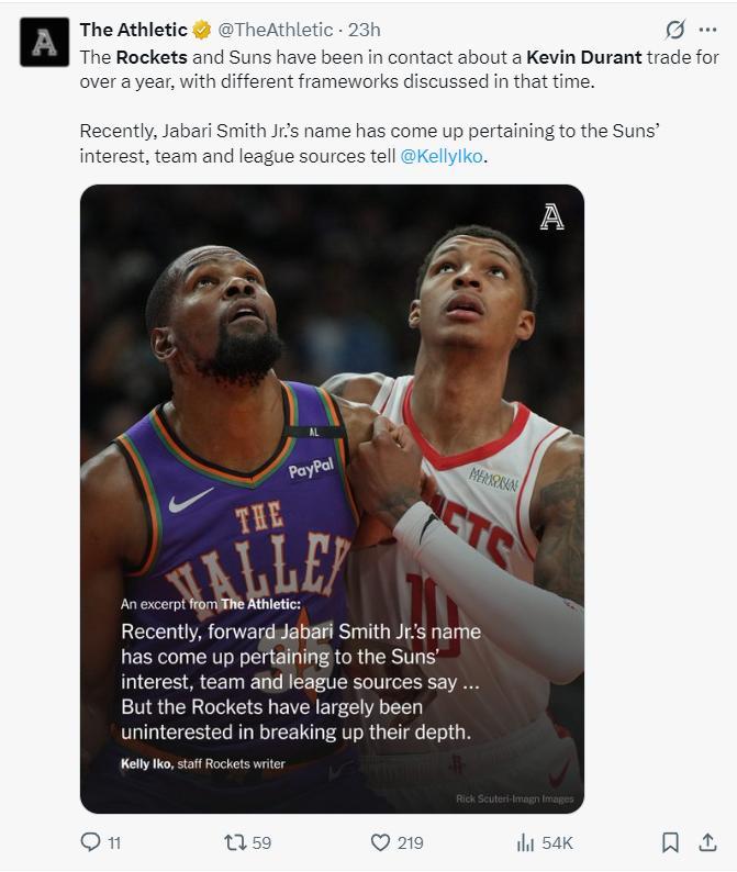 不過ESPN蒂姆-麥克馬洪透露,火箭隊認爲他們應該以一個合理的價格換到KD,而太陽覺得那並不是一個合理的價格。