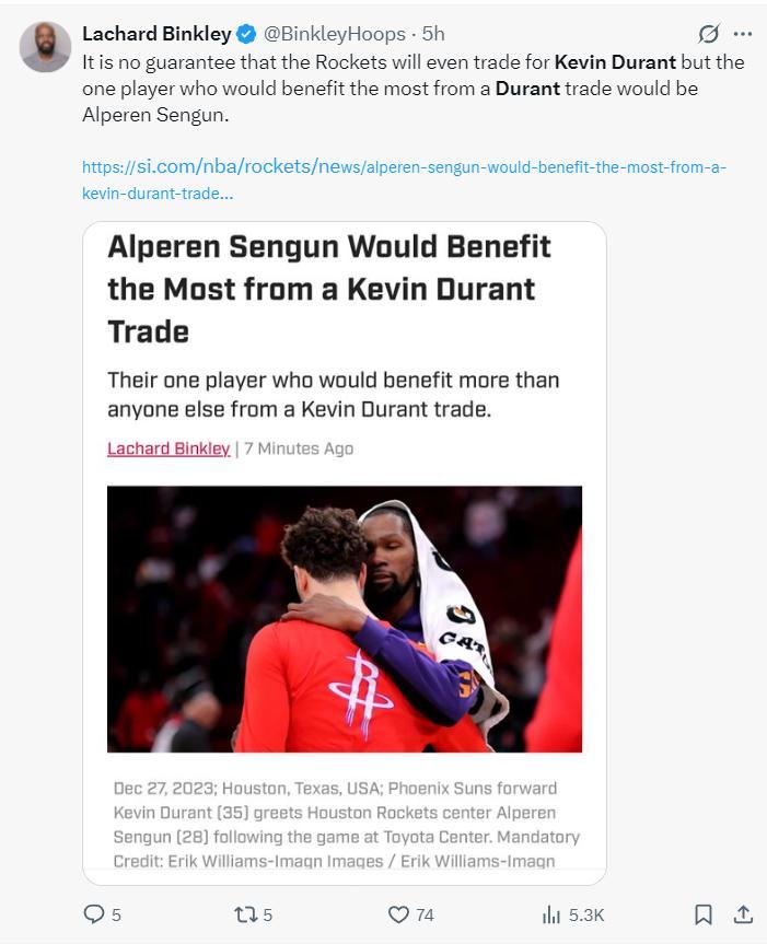 火箭隊記蘭德里-賓克利撰寫長文,他寫道:如果火箭隊交易得到凱文-杜蘭特,那麼阿爾佩倫-申京將是唯一受益的球員。