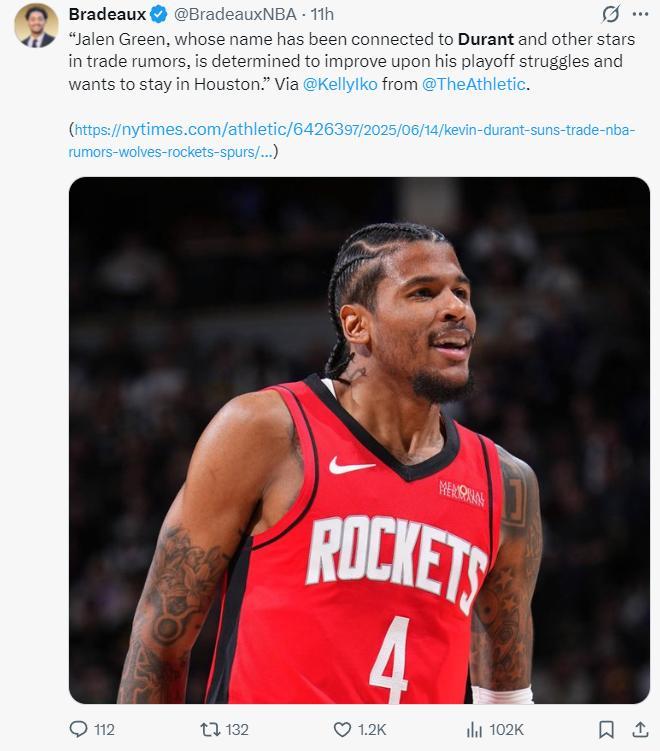 沒想到休媒Bradeaux連杰倫-格林都不肯出,他轉發凱利-伊科的言論:格林希望長留休斯頓,以彌補他今年在季後賽中的糟糕表現,近期他陷入了杜蘭特的交易流言中。