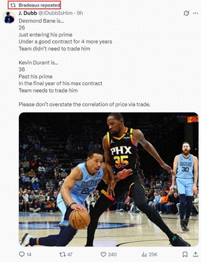 北京時間6月15日晚聯盟完成了一筆重磅交易,貝恩1換7包含4個首輪+1個首輪互換,不過美媒認爲貝恩的交易對KD的交易價值沒有任何影響,畢竟一個26歲還剩4年合同,一個36歲夕陽遲暮到期合同,休媒Bradeaux點讚了這篇推文。