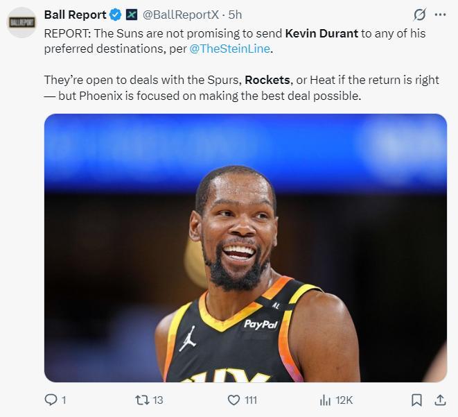 根據美媒Ball Report的報道,雖然杜蘭特只想去馬刺、火箭、熱火等球隊,可太陽只想在杜蘭特的交易中實現利益最大化,他們想要補強陣容繼續在西部立足。
