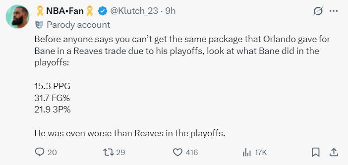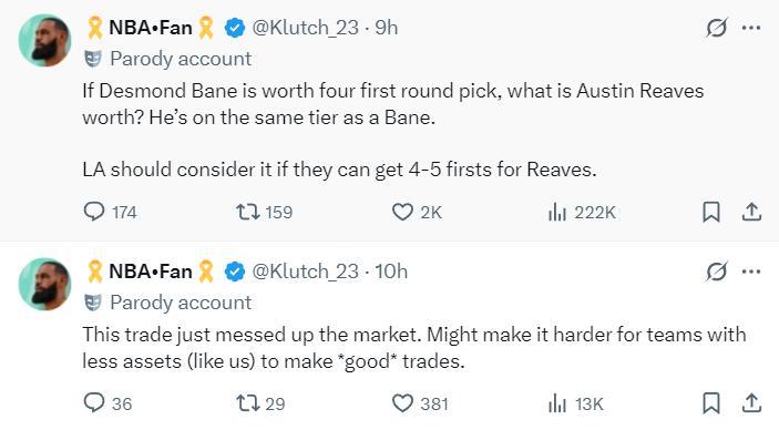德斯蒙德-貝恩竟然換了4個首輪籤+1個首輪互換權,要知道26歲的貝恩並不是聯盟的超級球星!就連盧卡-東契奇這樣的真超巨才換1個首輪籤而已,貝恩這筆交易讓湖人媒體NBA Fan很不滿,他覺得奧斯汀-裏夫斯也應該有同樣的交易價值。