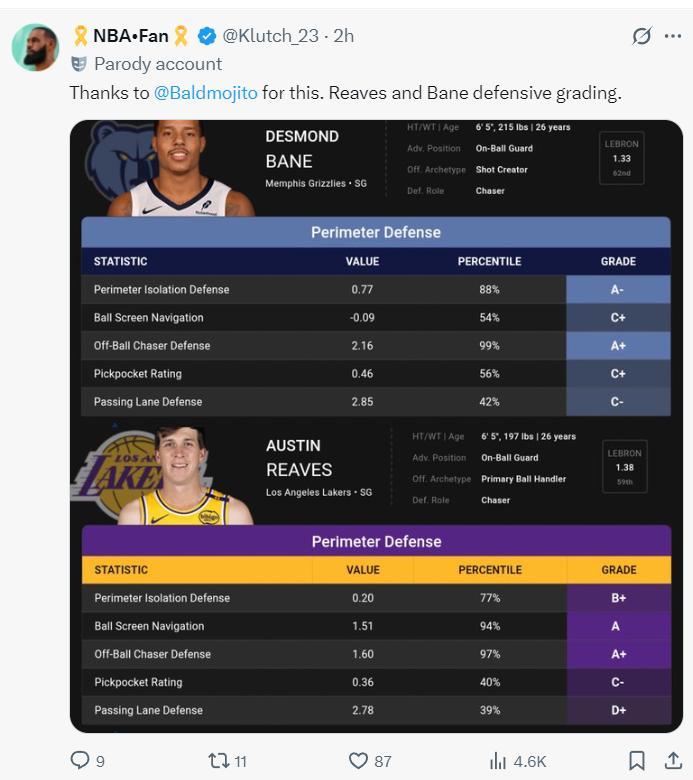 最後爵士記者託尼-瓊斯被懟的啞口無言,湖媒還曬出2K方面裏夫斯與貝恩的防守數據對比,裏夫斯防守表現也沒有比貝恩差太多。