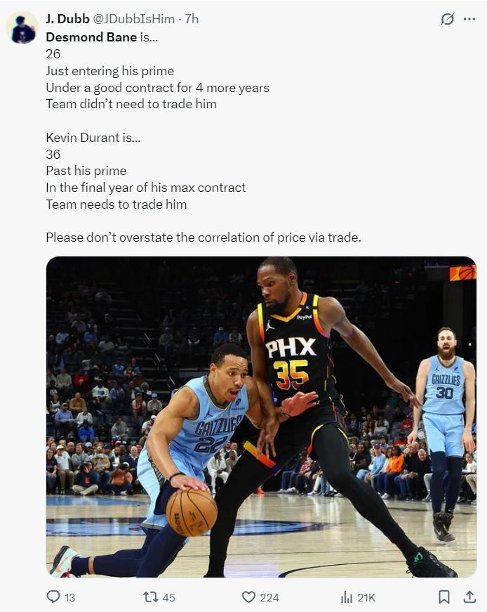2.杜蘭特年齡是36歲遲暮之年早已過了巔峯期,他是頂薪合同的最後一年也就是到期合同,太陽迫不得已只能交易他。請不要過分誇大交易的相關性。