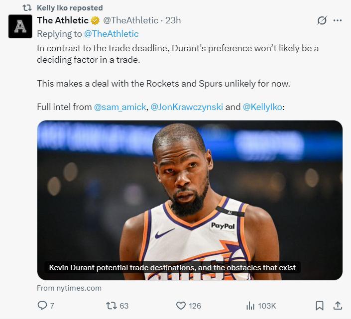 在文霍斯特與麥克馬洪的播客中,麥克馬洪也透露:我認爲火箭一開始真的想要交易得到杜蘭特,他們認爲可以用很合理的成本換來他,可太陽覺得那不是一個合理的回報。