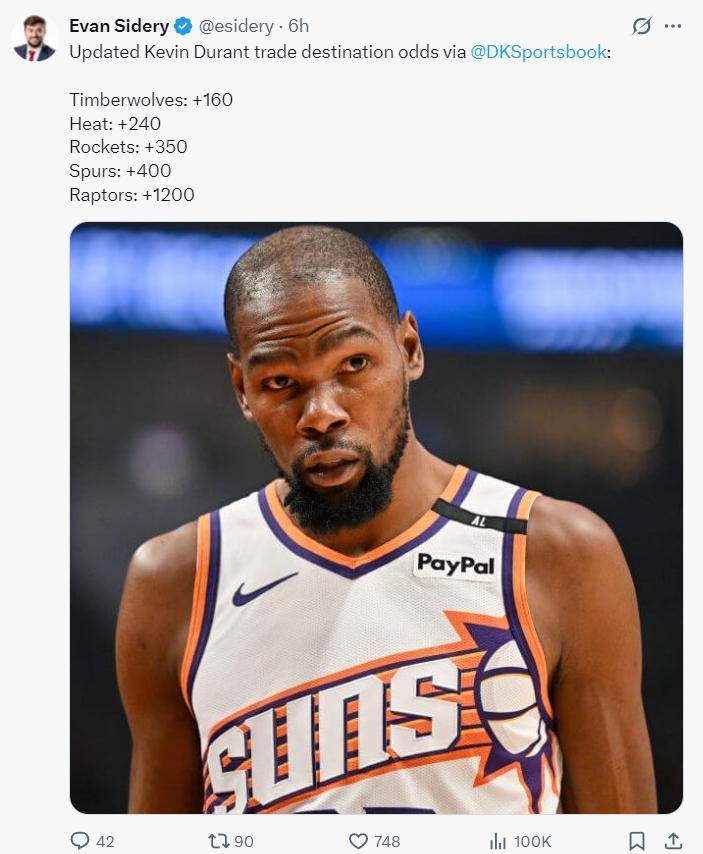 杜蘭特最想去的球隊是火箭、馬刺,馬刺已經明確退出(太陽覺得他們籌碼太差),火箭方面也拒絕爲杜蘭特支付高價,森林狼引進杜蘭特也存在疑慮,不知道太陽管理層是不是錯估了一個即將年滿36歲老炮的真實價格。
