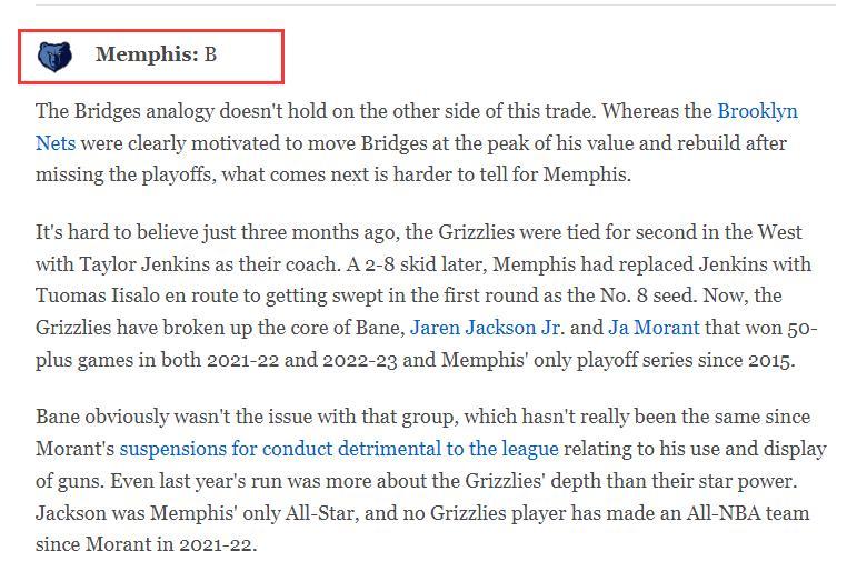 灰熊與魔術完成了一筆大交易,灰熊用貝恩換來了波普、安東尼、4個首輪籤、1個首輪互換權,這筆交易從外界看來灰熊纔是真正意義上的贏家,畢竟灰熊贏得了未來。