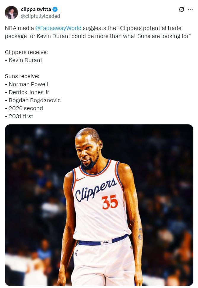 快船媒體還是不願意送走倫納德,他們希望快船用鮑威爾、德里克-瓊斯、博格丹諾維奇、2026年次輪籤、2031年首輪籤換來杜蘭特,這樣可以保留倫納德組成三巨頭。