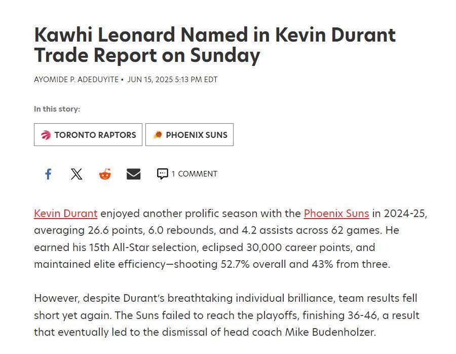 實際上在10多個小時之前,美國媒體速龍體育爆料,洛杉磯快船隊球星科懷-倫納德出現在了杜蘭特的交易談判中。但並沒有透露太陽、快船的交易談判進展到哪一步,畢竟KD與多支球隊都傳出緋聞。