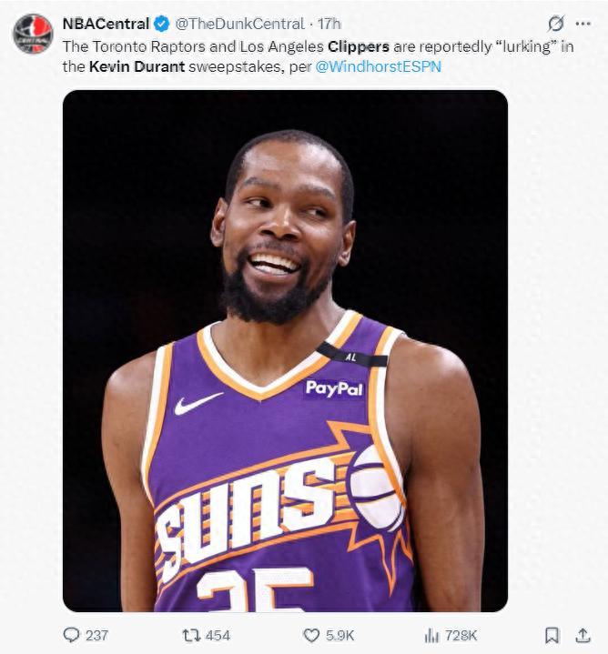 北京時間6月16日,ESPN記者布萊恩-文霍斯特在播客節目中透露,多倫多猛龍隊與洛杉磯快船隊“潛伏”着,他們也有意追逐凱文-杜蘭特。