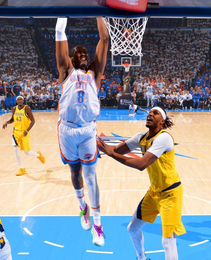 這場比賽雷霆終於在一開場就將自己的防守強度提升到Best級,步行者這邊是連續的出現失誤,OKC主場球迷聲浪也相當恐怖,雷霆在球迷的激勵下首節多次反擊暴扣,SGA首節7分3助攻,傑威首節6分3助攻1搶斷,要知道G4一戰雷霆全隊合計才11次助攻全靠單打取勝,而此役他們打的非常團隊。