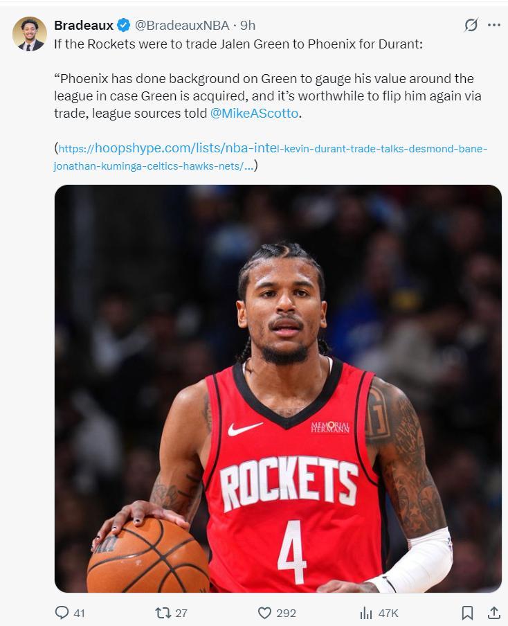 根據邁克爾-斯科特的說法:如果杰倫-格林最終被納入杜蘭特的交易中,太陽已經開始探索格林潛在的交易目的地,太陽已經開始對格林做背調以評估他在聯盟中的價值,萬一太陽將格林交易過來可以通過交易再次轉手。