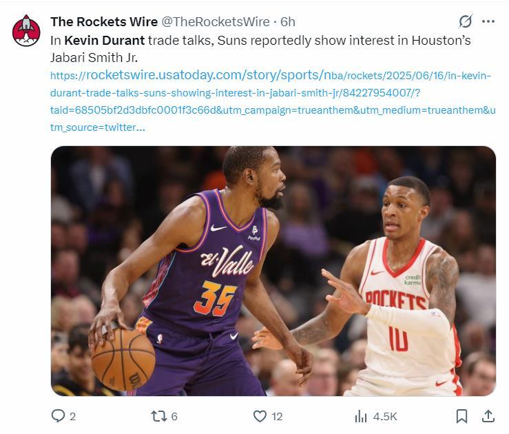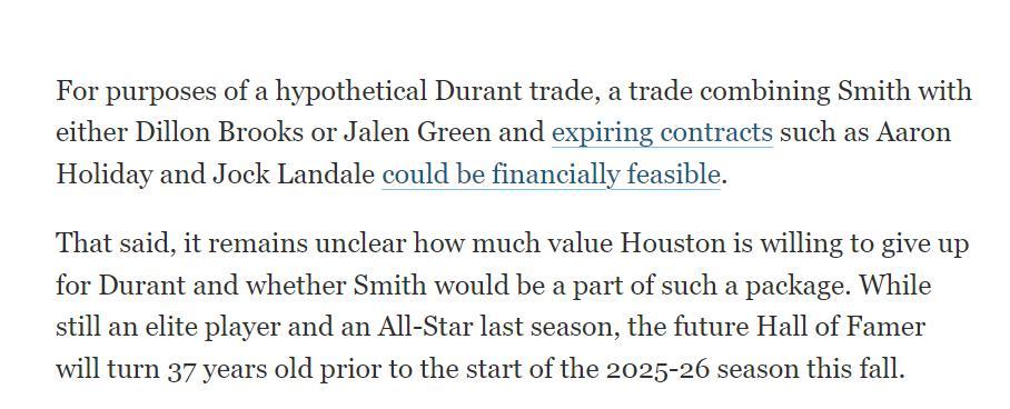 杜蘭特最想去的三支球隊馬刺、熱火、火箭,不過太陽希望用杜蘭特換來最大程度的籌碼,太陽目前還在估價中,但火箭有太陽想要的自己選秀權。