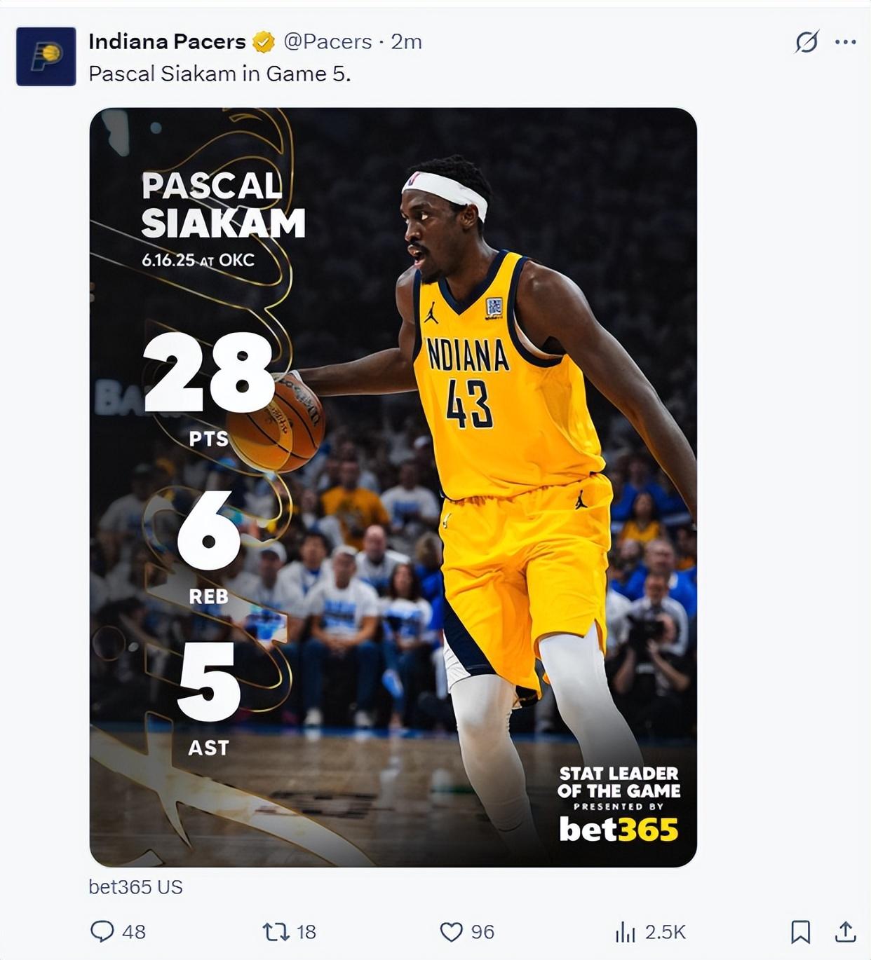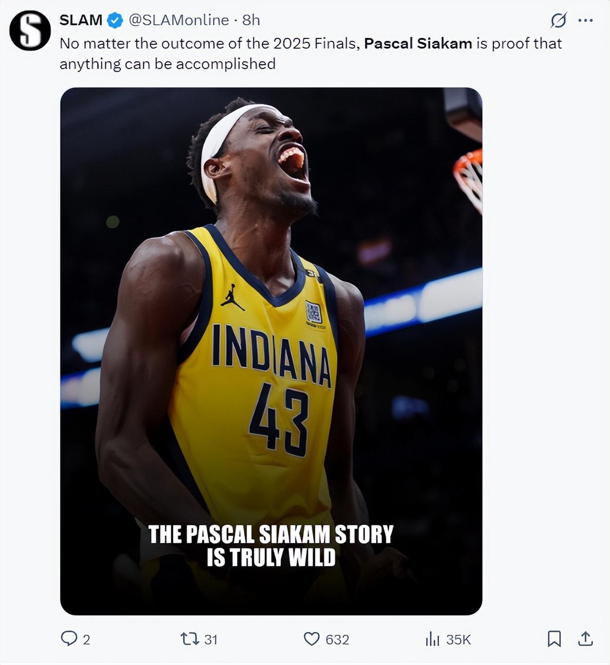 賽前灌籃雜誌就發聲:無論2025年總決賽的歸屬如何,帕斯卡爾-西亞卡姆就告訴了全世界沒有不可能。(西卡是一位勵志傳奇)