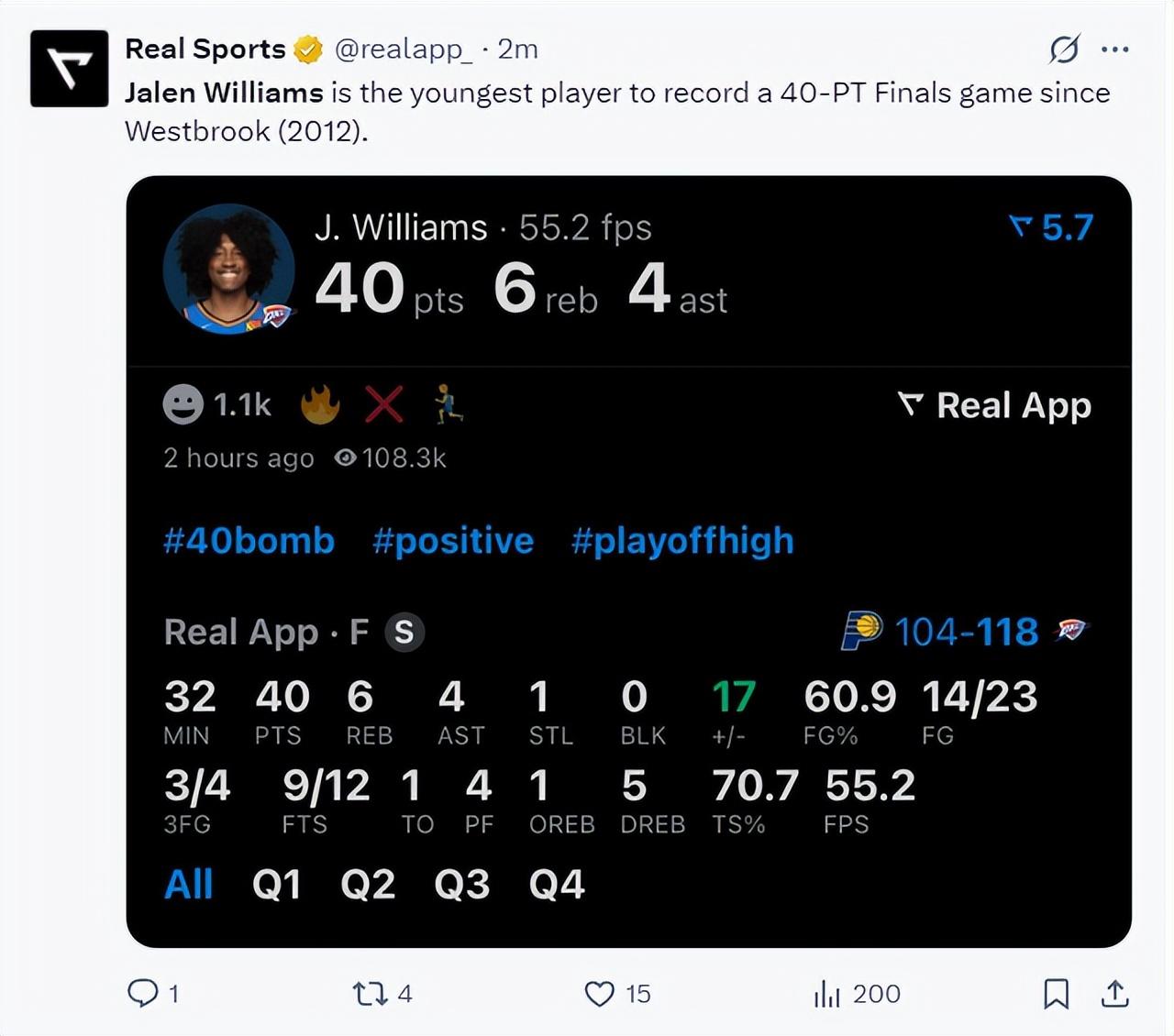 傑威也成爲2012年威少後雷霆隊史最年輕的40+先生。