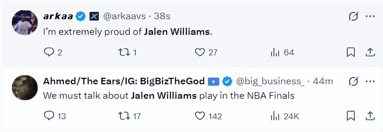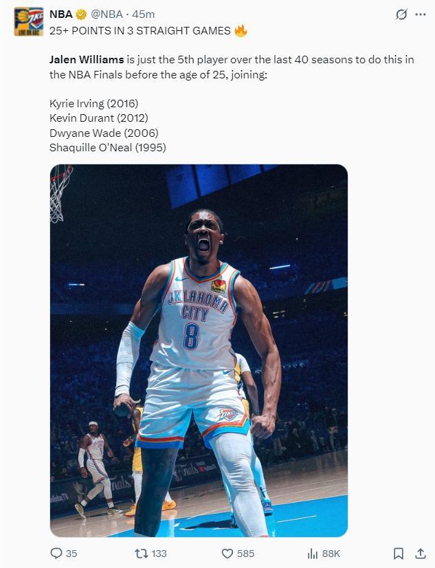 第三節傑威再中一個三分他已經完成20+,他總決賽連續三場都完成20+了,他也是今年除了SGA外首位在總決賽達成連續三場20+的球員。單節傑威5中4+三分1中1+罰球5中4拿到13分2籃板1助攻,三節17中10拿到29分5籃板4助攻已經是總決賽得分新高。