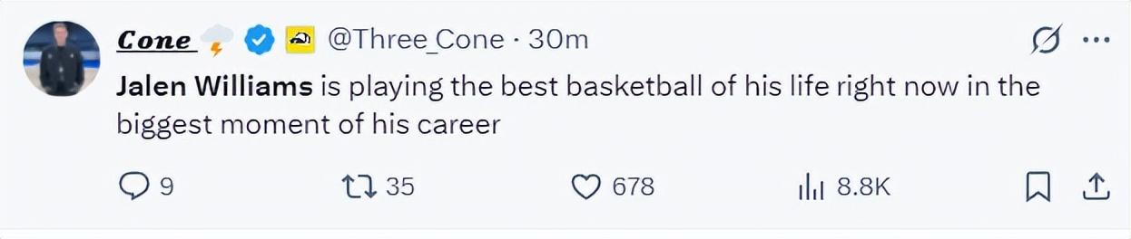 雷媒:傑威正在打職業生涯最出色的籃球,你們不能忘記他。