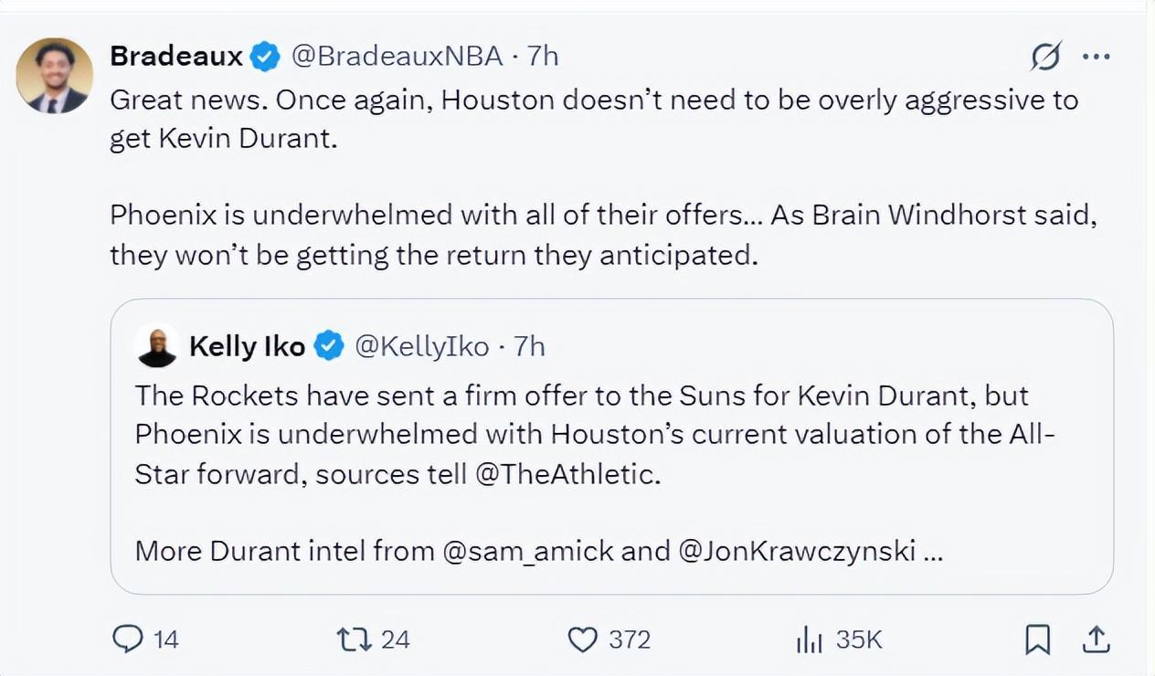 休媒Bradeaux轉推後寫道:“偉大的新聞,我再說一次,火箭根本不需要過於激進的去報價杜蘭特(無需加價)。太陽隊對我們提出的報價不感興趣,正如布萊恩-文霍斯特所說太陽很難得到他們想要的預期回報。”