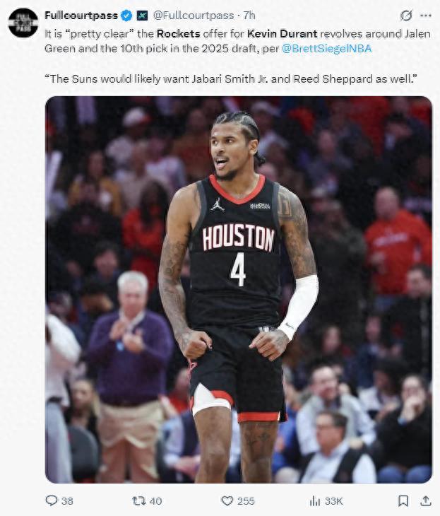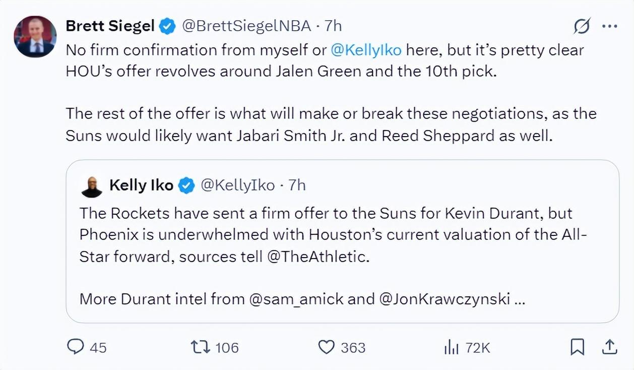 早些時候TA火箭記者凱利-伊科曾爆料,太陽與火箭已經就杜蘭特的交易進行過幾輪談判,太陽從一開始的索要火箭手中未來首輪,隨後又想要格林、申京等年輕資產,近期又盯上小賈巴里、謝潑德等人。