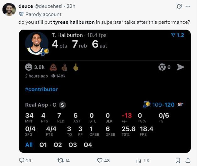 最終哈利伯頓的數據是34分鐘,6中0,三分4中0,罰球4中4,拿到4分7籃板6助攻3失誤,真實命中率25.8%,正負值-13。