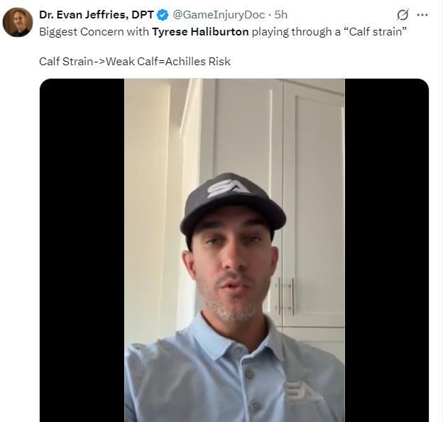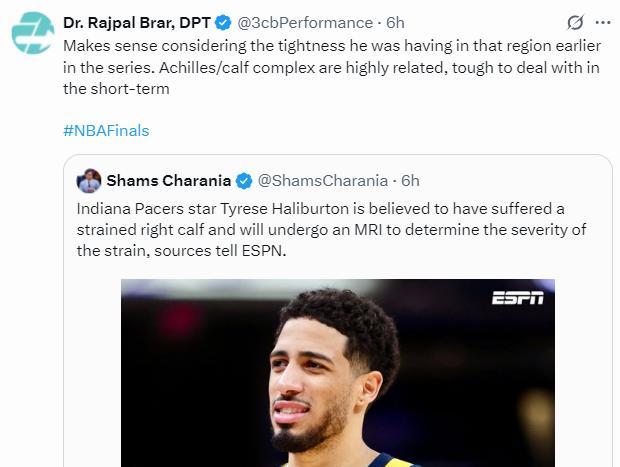 洛杉磯醫學專家Rajpal Brar解析哈利伯頓傷情:考慮到哈利伯頓系列賽早些時小腿位置的緊繃,小腿拉傷是合理的傷情,他這個可能是跟腱/小腿肌腱的複合傷情,短期內很難康復。