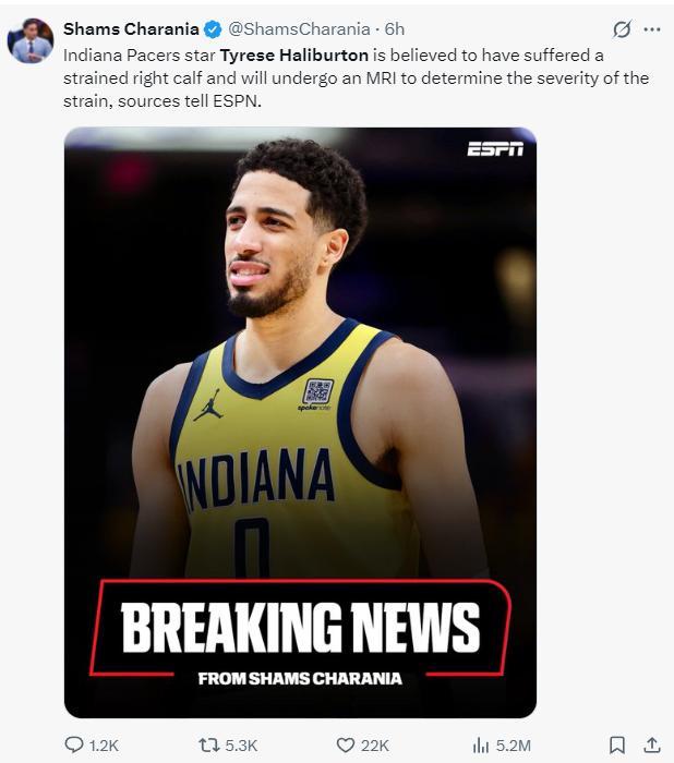 北京時間6月18日,ESPN名記Shams也透露,哈利伯頓已經確診小腿拉傷,他將進行核磁共振檢查以確定拉傷的程度。