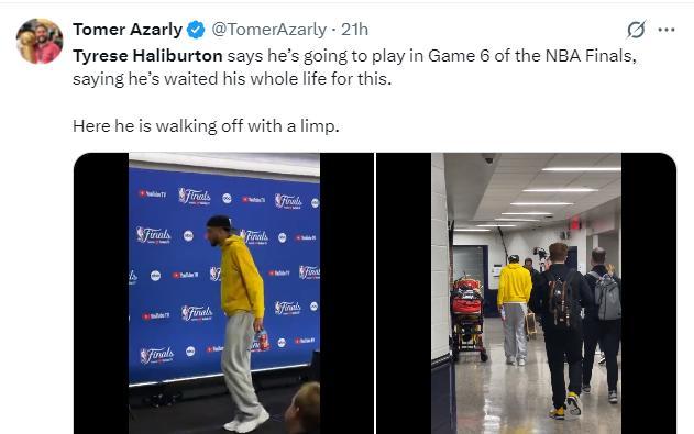 在G5賽後,快船記者Tomer Azarly從前方發回報道:哈利伯頓說他會在總決賽第六場出戰,他一瘸一拐的離開了球館。(視頻中能清晰的看到哈利伯頓行走都很困難,一瘸一拐的幅度很大)
