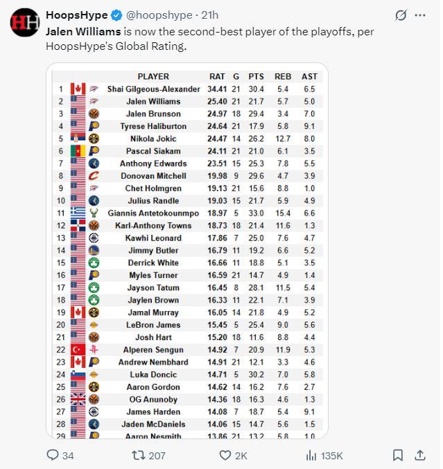 經過最近三場比賽傑威場均31分的表現,他的RAT值25.40衝到了聯盟第二,聯盟第一的就是SGA,看起來這兩人得爭奪FMVP了。