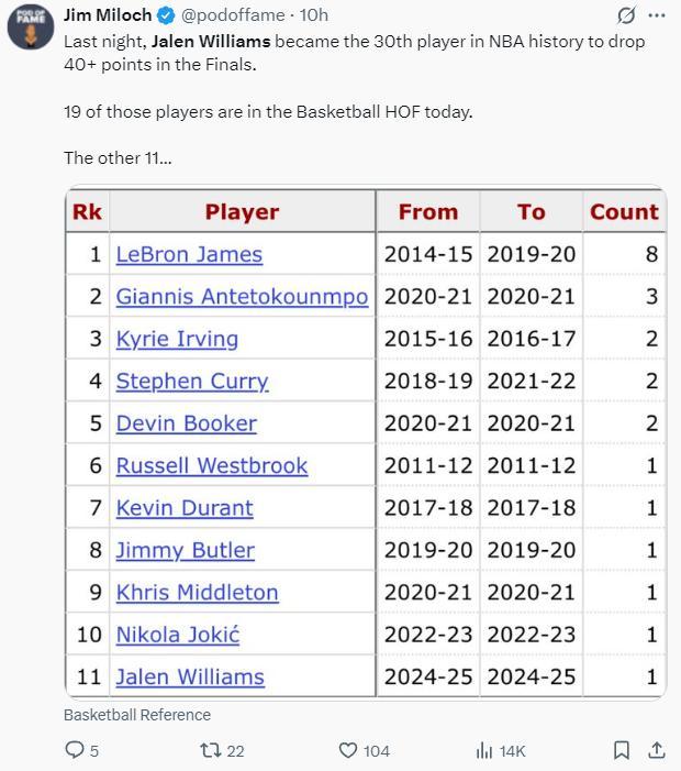 4.NB歷史上第30位在總決賽拿到40+的球員,其中有19位已經進入名人堂;