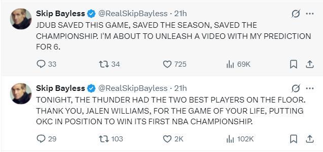 名嘴斯利普-貝勒斯在賽後高呼:傑威拯救了比賽,他拯救雷霆這個賽季,也拯救了他們的總冠軍之旅。