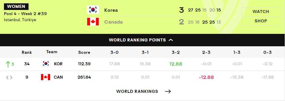 這場比賽韓國爆冷擊敗世界排名第九的加拿大,他們+12.88分,世界排名提升三個名次升至第34。
