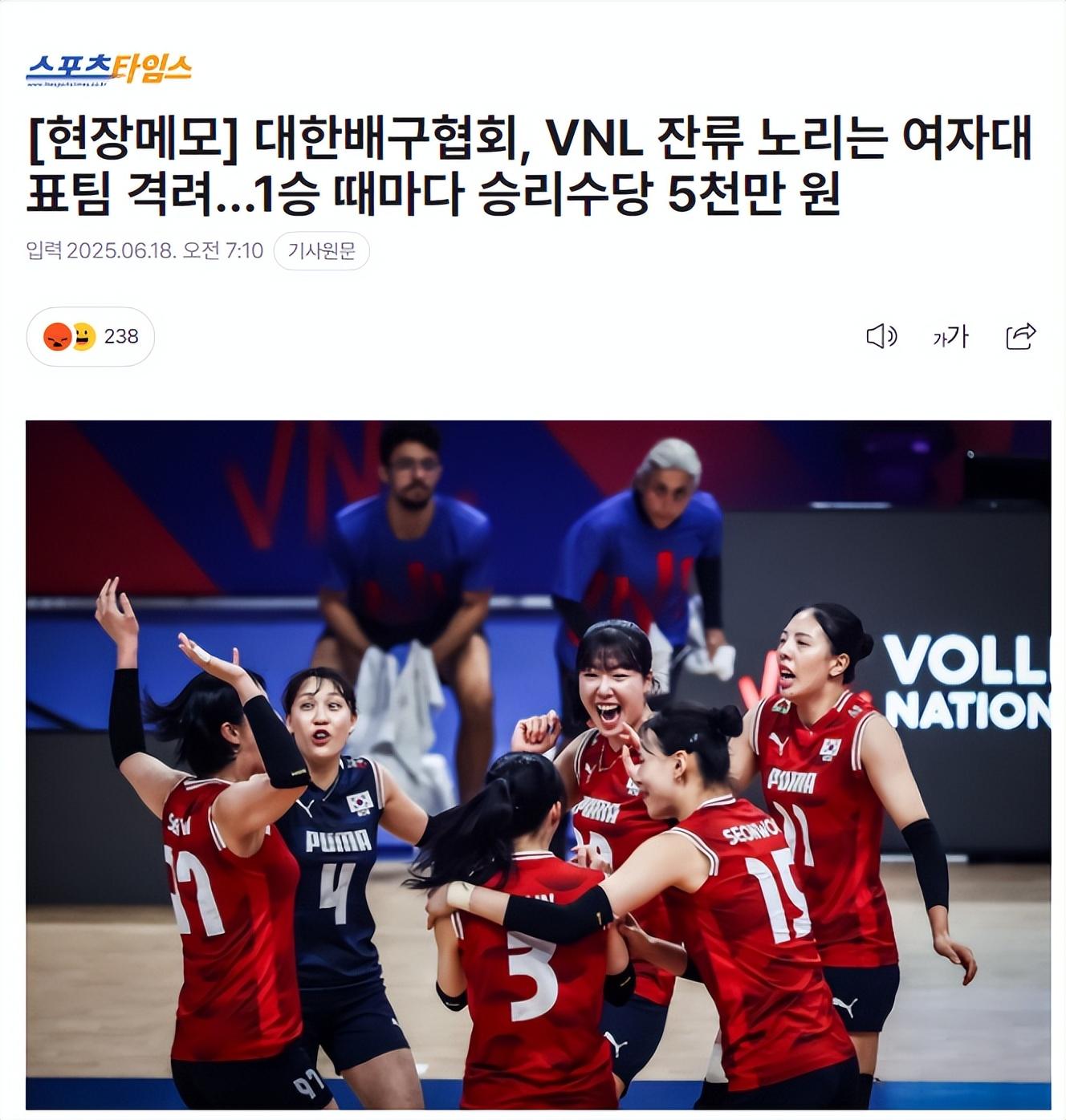 文中寫道:去年至今韓國女排的補貼獎金合計只有2000萬韓元,在今年首周遭遇四連敗後韓國排協決定增加激烈條款,只要在第二週、第三週每贏下一場比賽就能獲得5000萬韓元的獎勵。