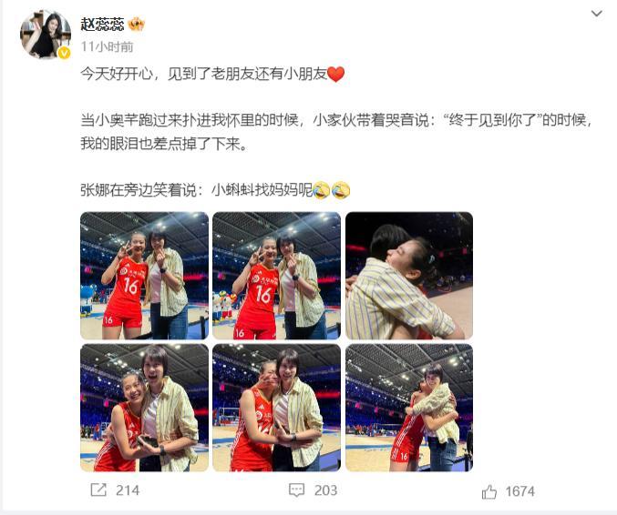趙蕊蕊也發文:當小奧芊跑過來撲到我懷裏的時候,小傢伙帶着哭腔說“終於見到你了”,當時我的眼淚也差點掉下來。張娜在旁邊笑着說“小蝌蚪找媽媽呢!”