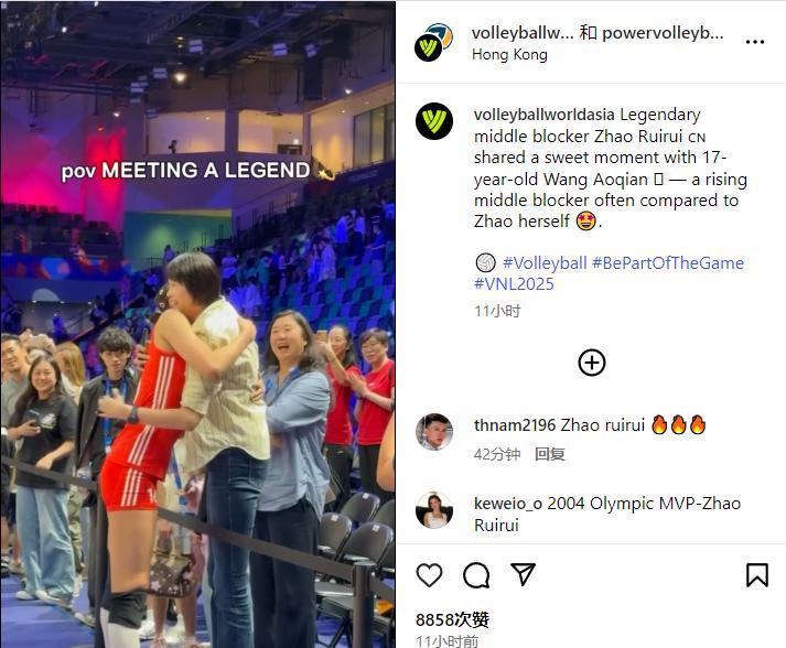國際排聯FIVB也在官方IG上寫道:中國傳奇副攻趙蕊蕊與17歲的王奧芊共度甜蜜時刻,——一顆冉冉升起的副攻,經常被拿來比做趙蕊蕊本人。