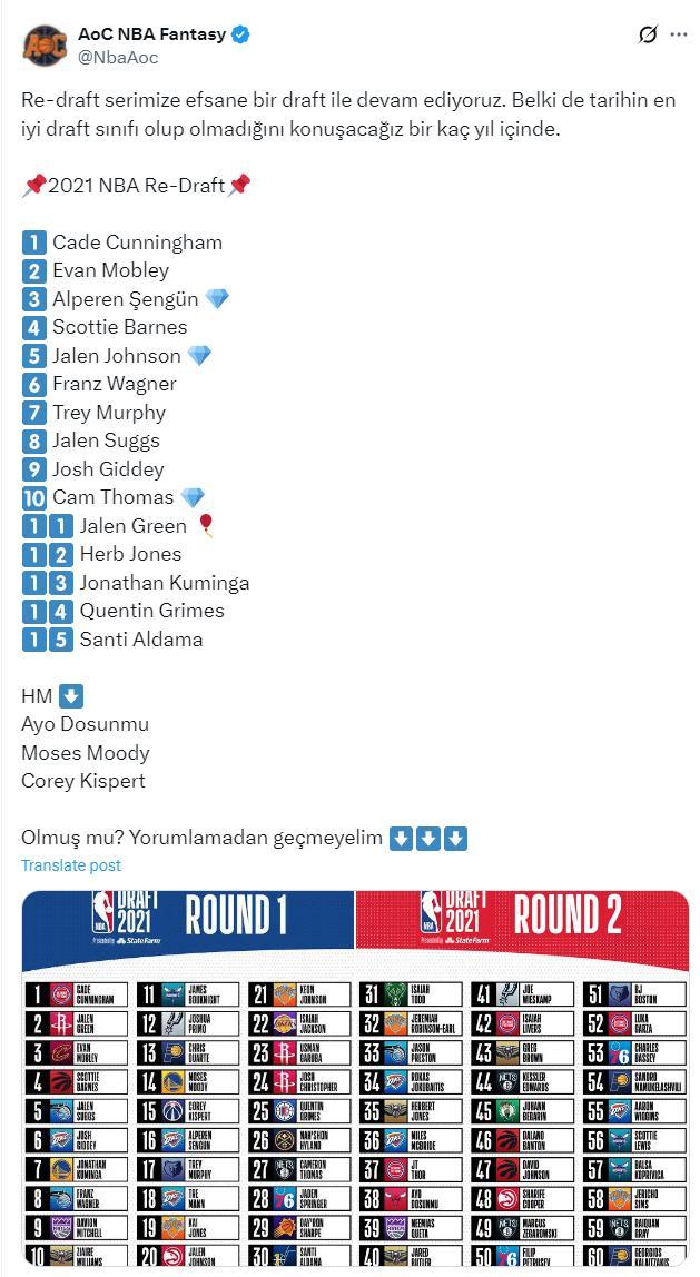 申京本賽季已經是場均19.1分10.4籃板4.9助攻1.12搶斷0.82蓋帽的全明星中鋒,他還險些入選最佳陣容,2021屆新秀重排他上升到探花位置。