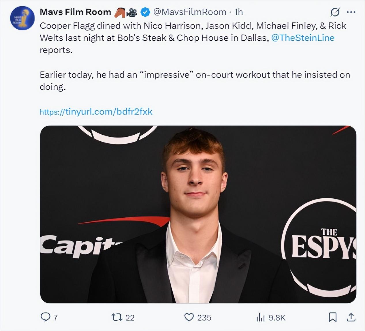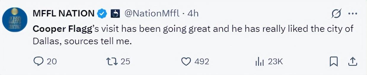 根據獨行俠媒體MFFL NATON的報道:弗拉格此次來訪達拉斯非常成功,他個人表示非常喜歡達拉斯這座城市。