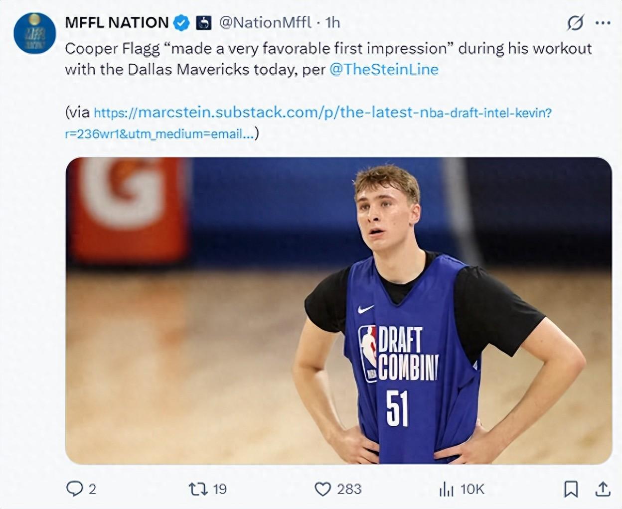 北京時間6月19日,狀元熱門庫珀-弗拉格已經完成了達拉斯獨行俠隊的試訓,這場試訓只進行了差不多一個小時,他在球場上的表現爲獨行俠管理層留下了“深刻的印象”。(根據此前的報道,除了試訓獨行俠外弗拉格沒有打算爲其他球隊進行試訓)