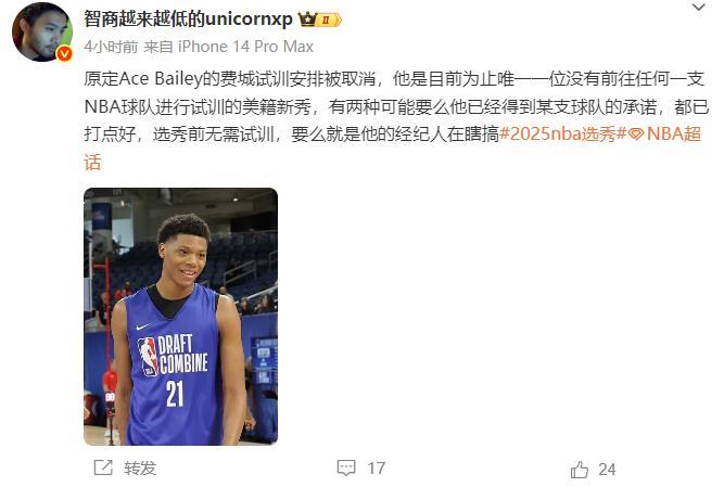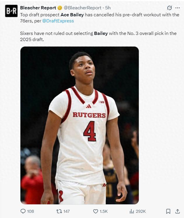 北京時間6月19日,2025年熱門新秀艾斯-貝利取消了費城76人的試訓,截至目前他沒有造訪任何一支球隊,這位今年的頂級新秀還表態在選秀大會前不會造訪任何一支球隊,他的經紀團隊堅信貝利纔是本屆最強新秀。
