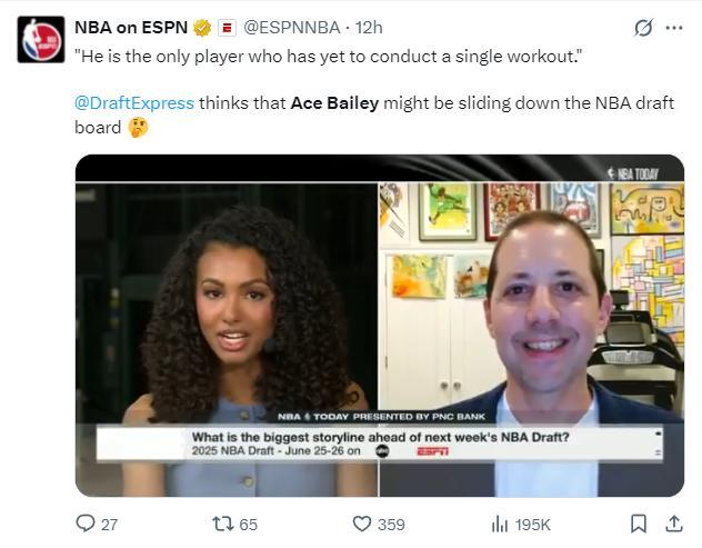 而NBA選秀專家喬納森-基沃尼在談到貝利團隊的選擇後,他說道:“貝利成爲唯一沒有進行任何試訓的熱門新秀,這會影響他的選秀行情。”