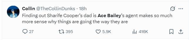 費城媒體:貝利的經紀人是沙里夫-庫珀的父親(奧馬爾-庫珀),這就足以說明爲何他們的選擇如此糟糕。(奧馬爾-庫珀手下只有貝利一人可能進入NBA的球員,其餘還剩幾個WNBA球員,他的公司經營不善)