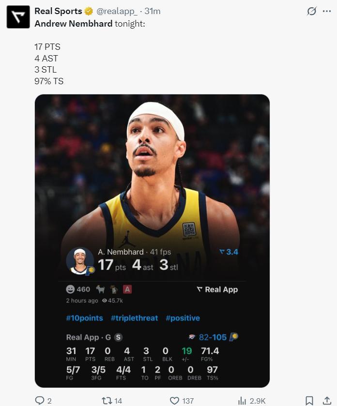 末節雷霆直接放棄比賽了,雷霆的先發五虎一個都沒上,這就讓卡萊爾有了讓哈利伯頓充足的休息時間,哈利伯頓只打了23分鐘12中5+三分7中3拿到14分5助攻1籃板2搶斷1失誤打卡了,但西卡、內史密斯、特納、麥康等主力都在場上穩定局勢。