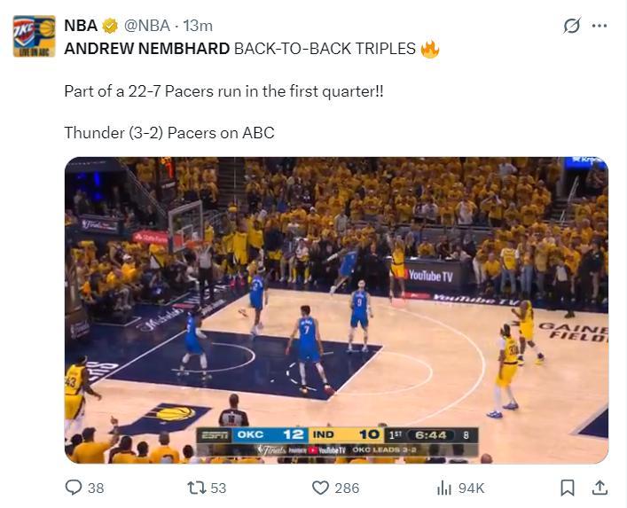 這場G6內姆布哈德開場手感特別火燙,連續兩個回合命中三分球,單節10分鐘裏3中3+三分2中2拿到2搶斷,要知道他總決賽系列賽最高分才14分而已。半場打完內姆布哈德已經拿到10分,步行者三人上雙而且領先雷霆22分之多。