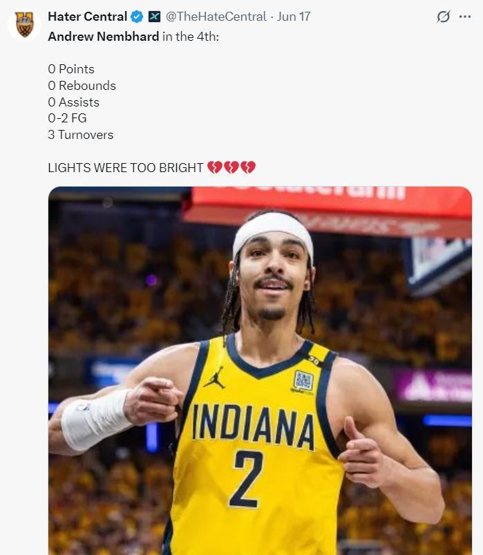 總決賽天王山,內姆布哈德是步行者的第一罪人,他在末節2中0+3失誤,決勝時刻他與哈利伯頓合計5個失誤,讓原本2分的差距瞬間來到15分,內姆布哈德個人也十分的自責,他如果G6還不發揮鐵定會被印城球迷的唾沫所淹沒。