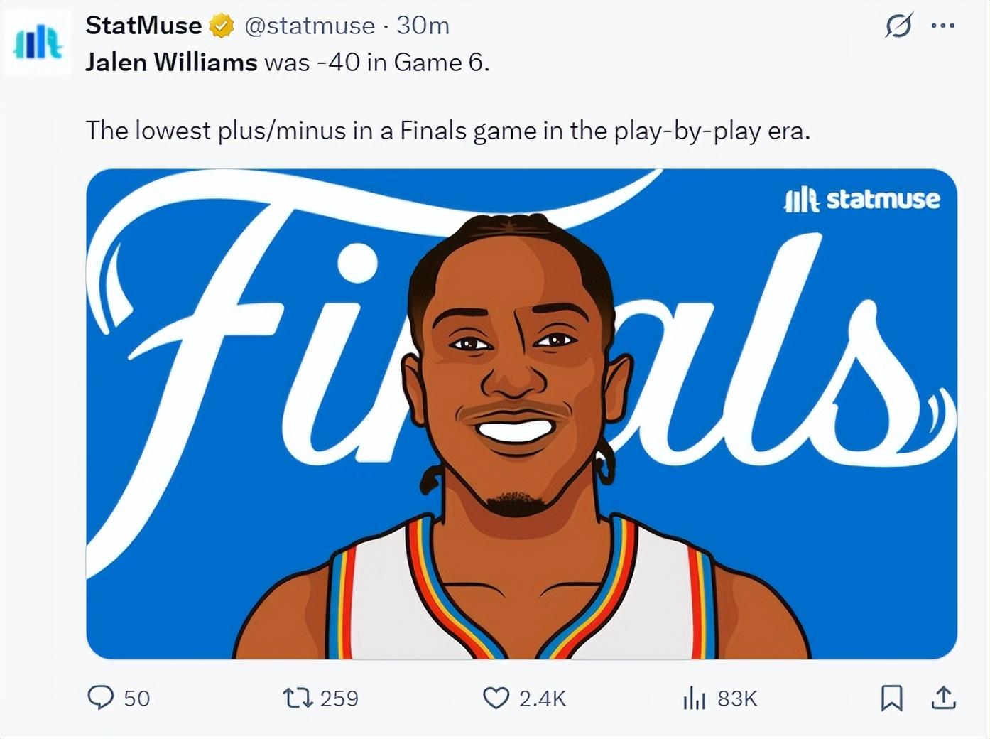 美媒寫道:這場G6傑威正負值-40,這是總決賽歷史上正負值最低的一次。