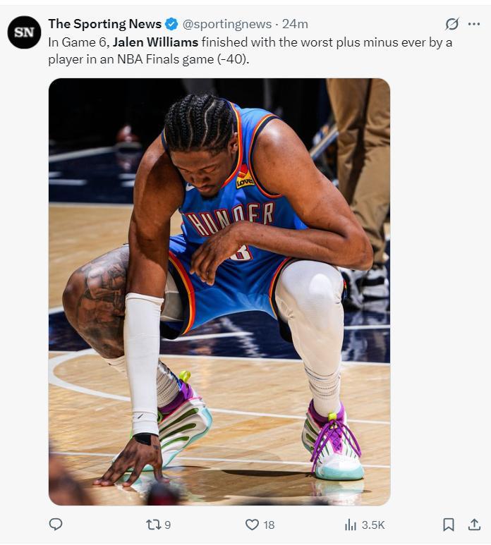 北京時間6月20日,總決賽G6,雷霆以91-108不敵步行者,大比分3-3平。這場比賽傑威的個人表現十分糟糕,上半場他還拿到16分,可第三節直接隱身拿0分,他還被西卡給隔扣了,最終他全場16分,正負值-40雷霆最糟更是創造NBA總決賽歷史最差。